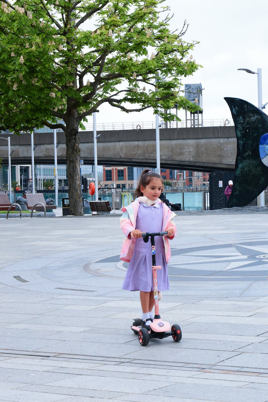Picture of a little girl on scooter. Uniform. Pink gradient. Pink color palette,